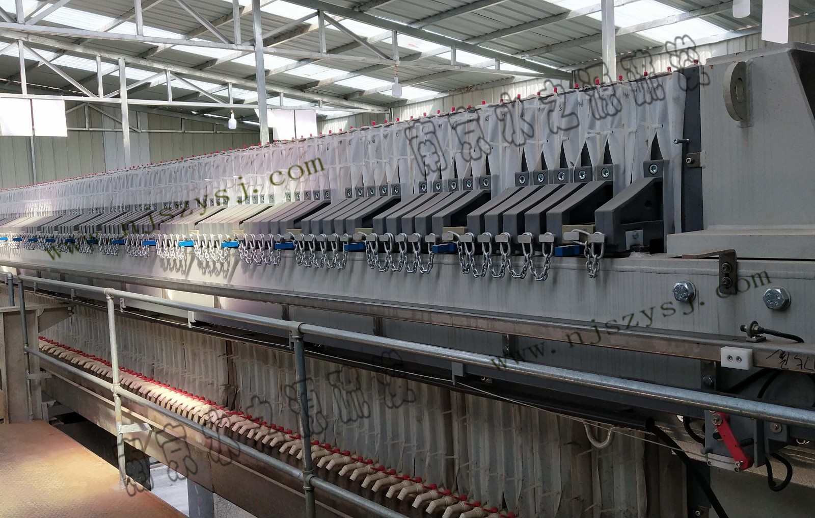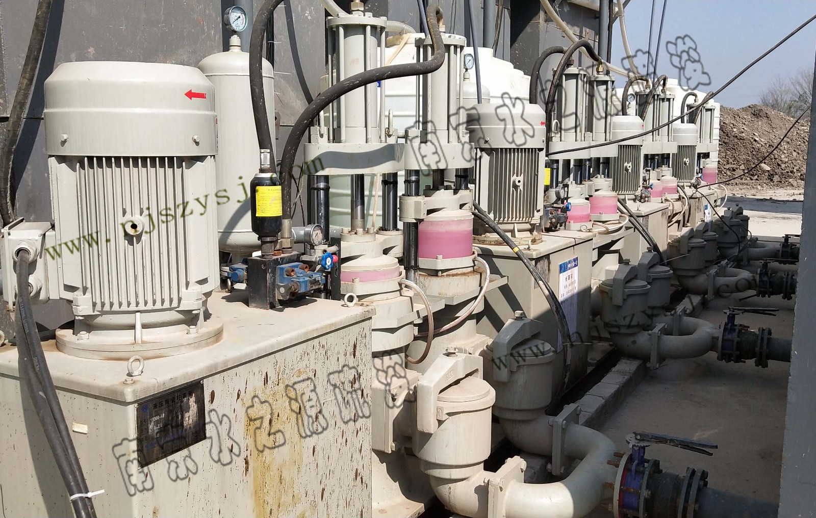 底泥压榨系统:调理好的底泥经进料泵送至河湖清淤专用高压快速压榨机,由高压油泵提供强压来压榨底泥,同时挤压压缩滤板之间空隙内的底泥,使滤板之间空隙内的底泥获得再次压榨,得到含水率60%以下的块状泥饼。